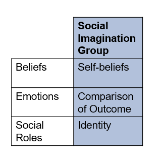 Periodicity. Beyond simply listing the concepts used in psychological research, Michie's approach holds out the potential for finding related groups of items. These are shown at the bottom of the cluster analysis diagram above. For instance, Michie's Group 12 incorporates self-belief, comparison of outcome, and identity. What all of these approaches have in common is that they speak to the notion of who one is, a fundamental sense of self that is expressed in emotional, cognitive, and social or interpersonal terms. A sense of self implies the presence and perceptions of other people, and may relate to the TMT concept of social imagination, one of the key functions of the Narrative Mind. Indeed, personal narratives seem to underlie all three concepts: beliefs about oneself (including self-talk, the things that you say to yourself about yourself), persuasion by others ("comparison of outcome" in Michie's model), and taking on a role or identity that defines one in society. These three items in Michie's taxonomy do seem related to one another, and there may even be an underlying biological mechanism (the Narrative Mind, centered in the prefrontal cortex) that can account for all three of them. Here's the list in periodic-table form: